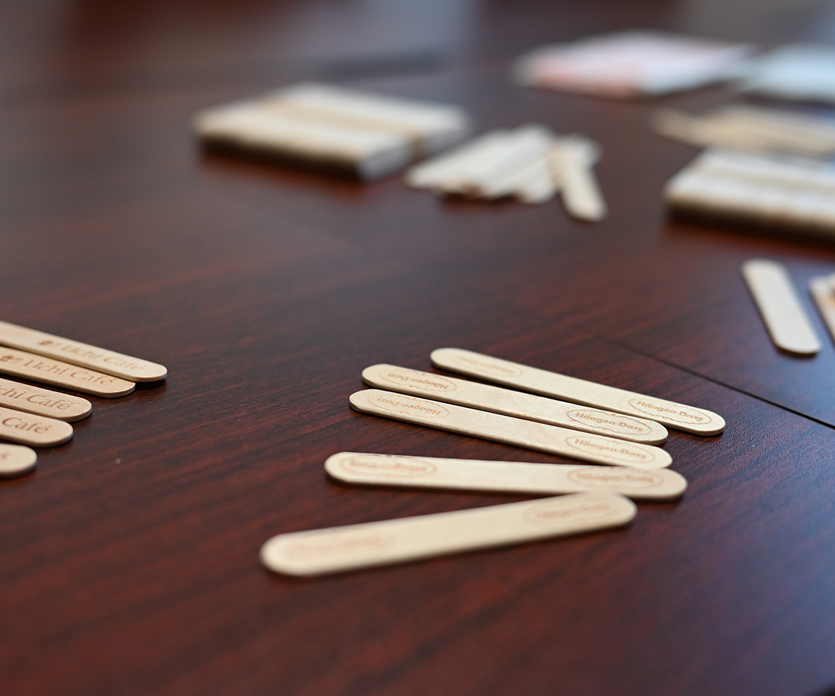 一般的にアイスの棒の素材には白樺が使用されていますが、伐採後でも自生が可能な竹や、植林やリサイクルなどが成熟した紙素材を研究し、製品開発を進めています。