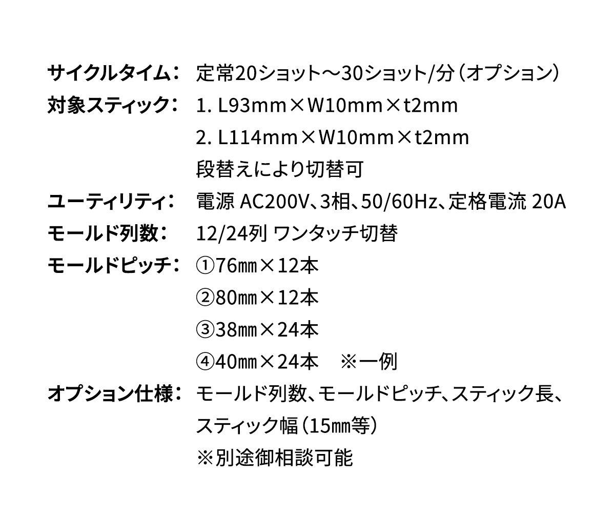 ミックスの種類を選ばず、モールドへスティックを自動挿入します。オプションの画像監視システムでは、スティックの欠陥やズレをセンサーカメラで検知し、NG品を排出、もしくは生産ラインに通知し、検査記録がサーバーへ保存されます。